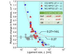 金海军研究员团队在电化学环境下进行原位压缩实验,比较纳米晶和粗晶纳米多孔金属的力学行为,成功分离出纳米金属强度的STJ效应,并确定其开始发挥作用的临界尺寸。