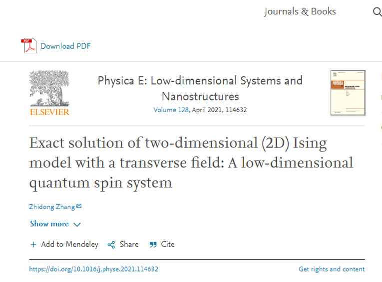 我国科学家在量子相变理论取得重要研究进展,沈阳材料科学国家研究中心张志东研究员求出二维横场伊辛模型的精确解。这是张志东研究员在求出铁磁性三维伊辛模型精确解、确定自旋玻璃三维伊辛模型计算复杂度下限之后取得的又一项重要研究成果。