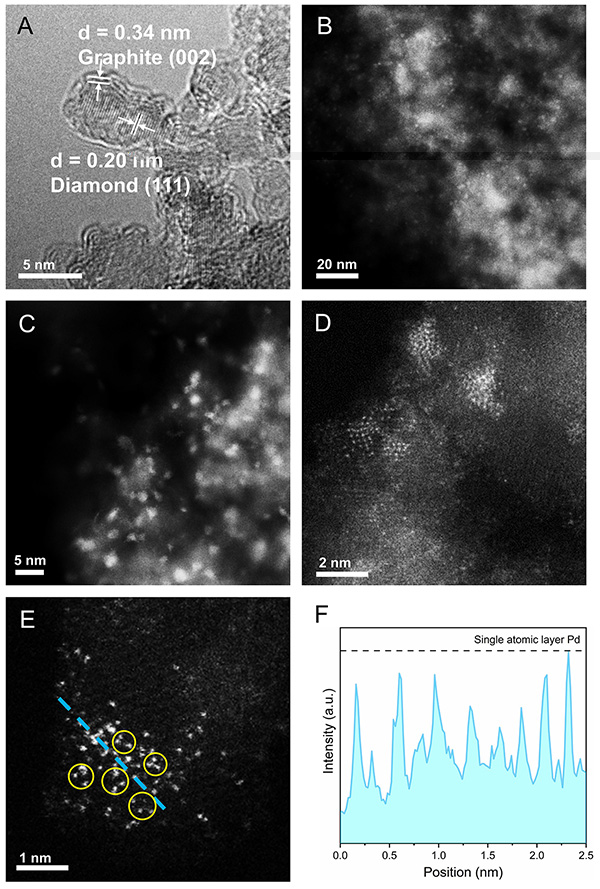 图 1 载体ND@G (A) 和Pd金属团簇 (B-F)球差电镜STEM图像与分析。