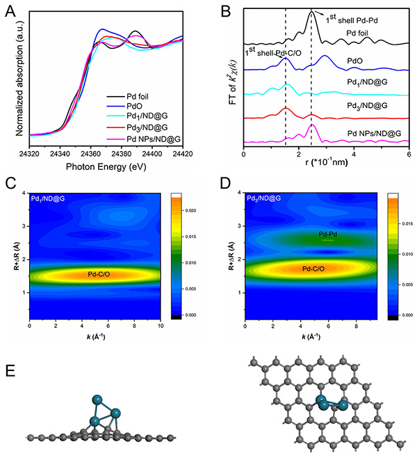 图2. (A) X射线吸收近边结构谱图;(B) 傅里叶变换后R空间径向结构函数;(C, D) Pd1/ND@G和Pd3/ND@G的EXAFS振荡小波变换;(E) Pd3 金属团簇的最优结构模型图(左:侧视图,右:俯视图)。