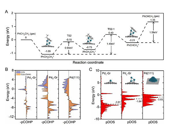 图 4. Pd催化剂上乙苯直接脱氢反应能量变化曲线及投影晶体轨道哈密顿布居(pCOHP)和投影态密度(pDOS)结果分析。