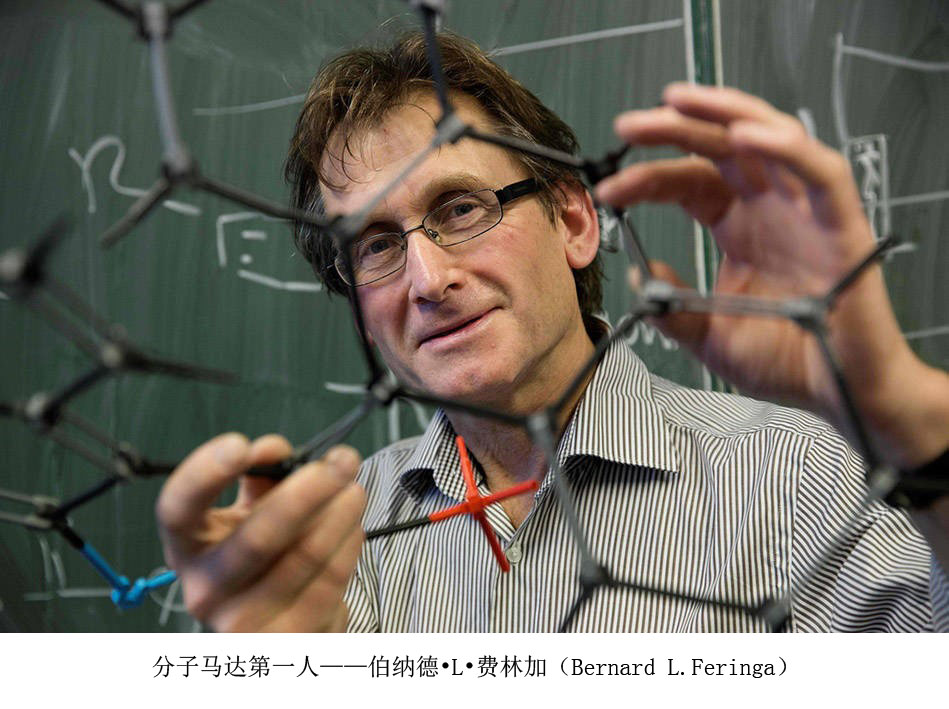 而费林加则完成了第三步,成功开发出了世界上第一个分子马达。1999年,费林加发明出了可以向同一个方向不停旋转的分子转子叶片:它含有两个相同的叶片单元,当分子被暴露在紫外线光的脉冲下,一个动叶片围绕中间的双键跳了180度。然后,棘轮移动到指定位置。随着下一个光脉冲的带来,动叶片又跳了180度。如此持续下去,分子马达就会朝同一个方向旋转起来。现在他的研究小组已经将其优化,转速可达每秒1200万转。利用分子马达,他驱动了一个28微米长、比马达本身大1万倍的玻璃圆筒。