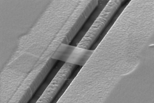Fig. 1. Graphene nanomechanical resonator fabricated by suspending a few-layer graphene sheet over the gate electrode of a superconducting cavity. Device done and image taken by Peter Weber, Yiannis Tsioutsios and Johannes Guettinger, ICFO, Barcelona.