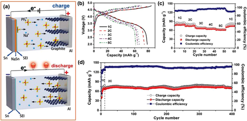 (a)为新型双离子电池的反应原理示意图,(b)为不同倍率下的充放电曲线,(c)为倍率性能曲线,(d)为2C倍率下的循环性能曲线。