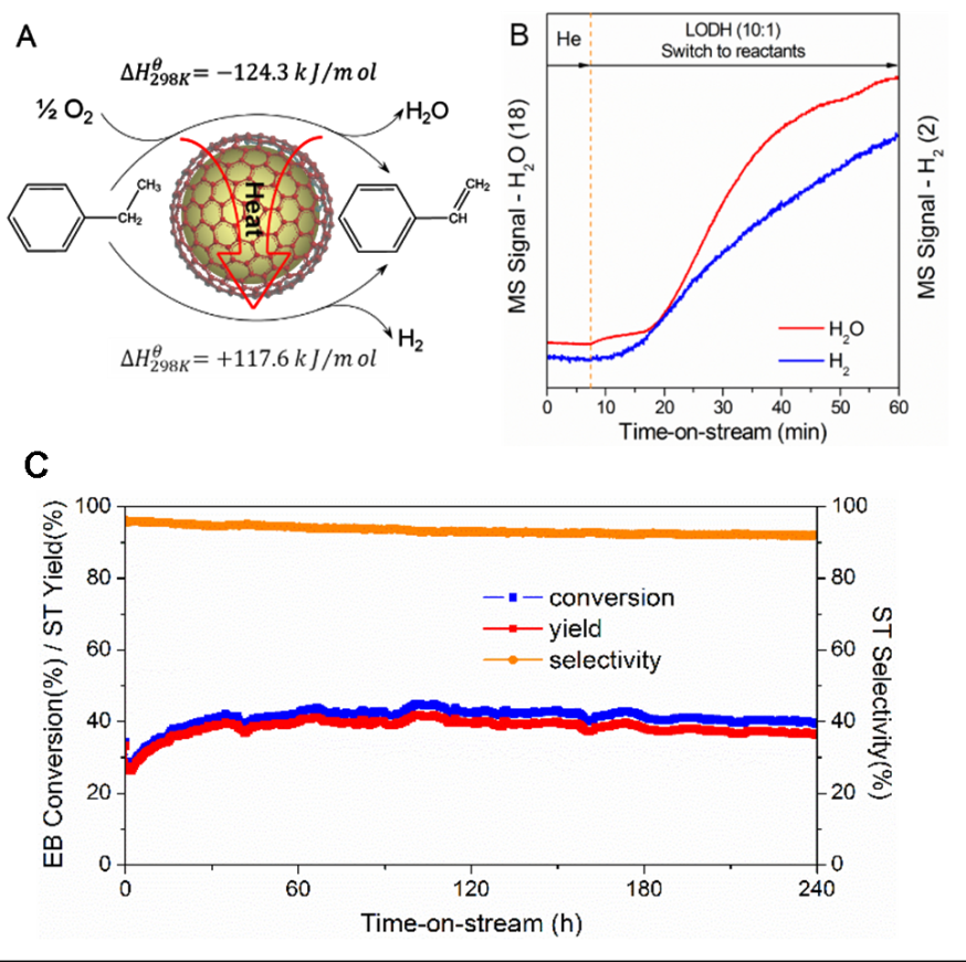 图1 (A) 贫氧气氛下乙苯直接脱氢和氧化脱氢在纳米金刚石表面的耦合示意图,(B)质谱对催化反应过程进行原位检测结果,(C)贫氧气氛下纳米金刚石的长寿命测试实验。