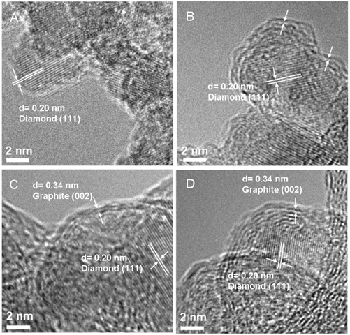图2 贫氧条件下不同反应时间的纳米金刚石催化剂的电镜表征结果,(A) ND-fresh; (B) ND-LODH-5-30h; (C) ND-LODH-5-240h; (D) ND-LODH-5-500h。